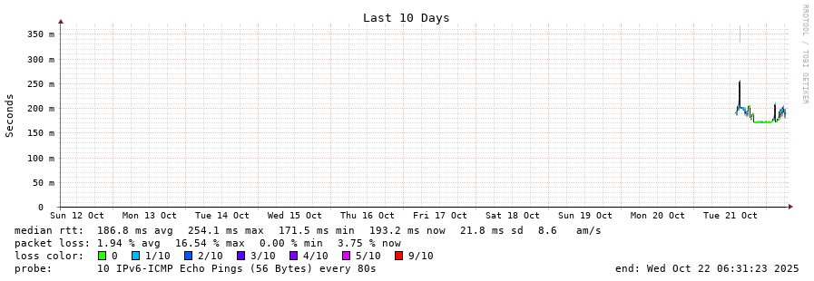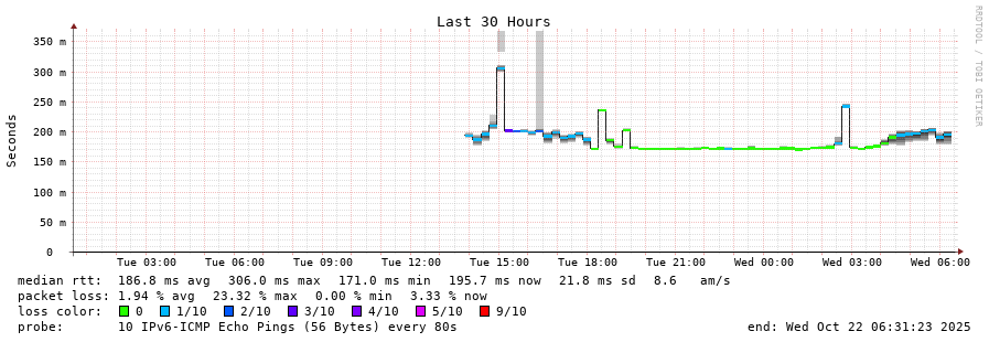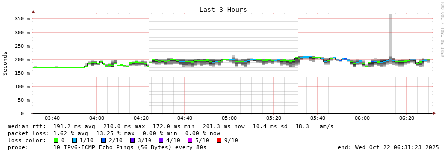 traceroute to 2001:67c:1e0:0:c225:e9ff:fea8:6a0a (2001:67c:1e0:0:c225:e9ff:fea8:6a0a), 30 hops max, 80 byte packets - Generated at 2025-10-21 18:15:01