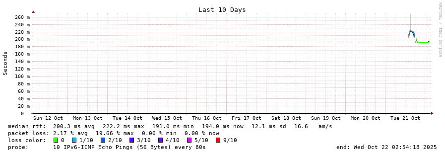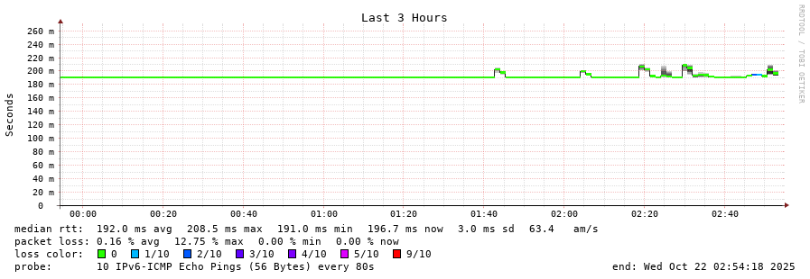 16 > 2a02:2f00:8708::c9 (2a02:2f00:8708::c9) [AS8708] 193.057ms 193.180ms 193.244ms
